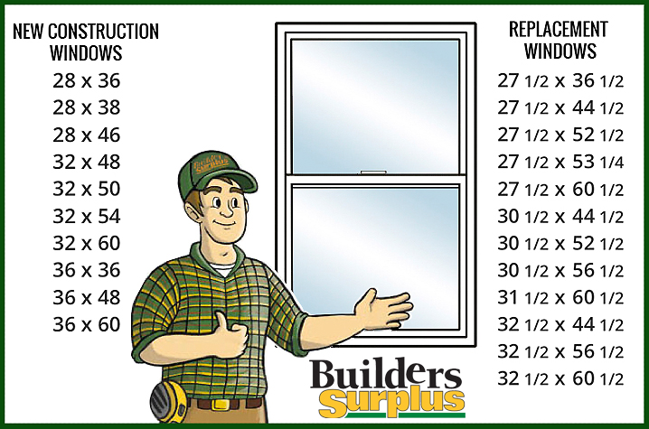 Every home is designed to different measurements and styles. The sizes at Builders Surplus vary from 28” x 36” to 36” x 60” for new construction windows; and 27-½” x 36-½” to 32-½” x 60-½” for replacement windows.